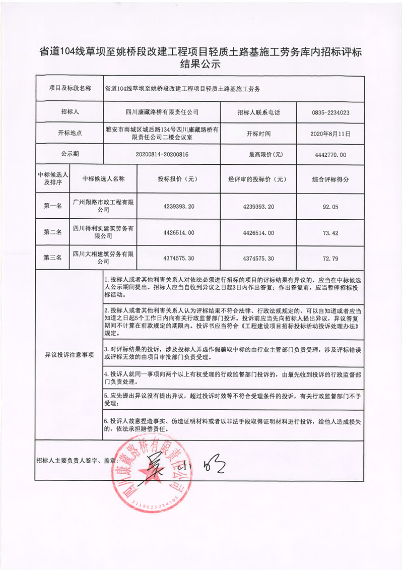 四川康藏路橋有限責(zé)任公司省道104線草壩至姚橋段改建工程項(xiàng)目輕質(zhì)土路基施工勞務(wù)庫(kù)內(nèi)招標(biāo)評(píng)標(biāo)結(jié)果公示