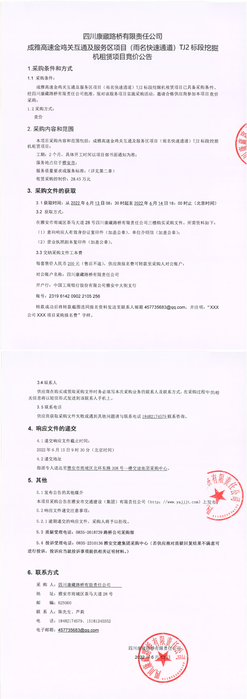 四川康藏路橋有限責(zé)任公司成雅高速金雞關(guān)互通及服務(wù)區(qū)項(xiàng)目(雨名快速通道)TJ2標(biāo)段挖掘機(jī)租賃項(xiàng)目競價(jià)公告