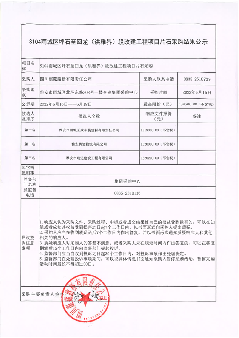 四川康藏路橋有限責(zé)任公司S104雨城區(qū)坪石至回龍(洪雅界)段改建工程項目片石采購結(jié)果公示