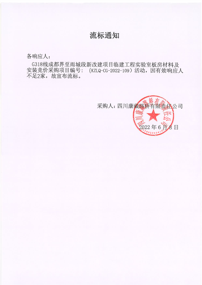 四川康藏路橋有限責(zé)任公司G318線成都界至雨城段新改建項(xiàng)目臨建工程實(shí)驗(yàn)室板房材料及安裝采購流標(biāo)通知