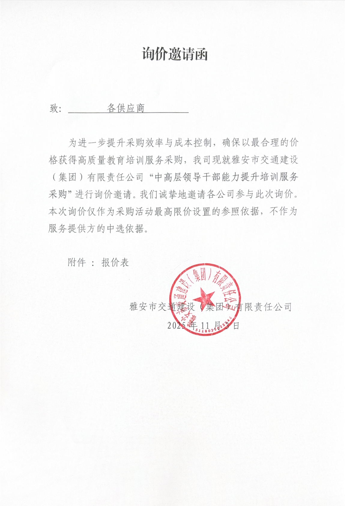 關(guān)于雅安交建集團下屬子公司主要負責人經(jīng)濟責任審計項目限價的詢價函