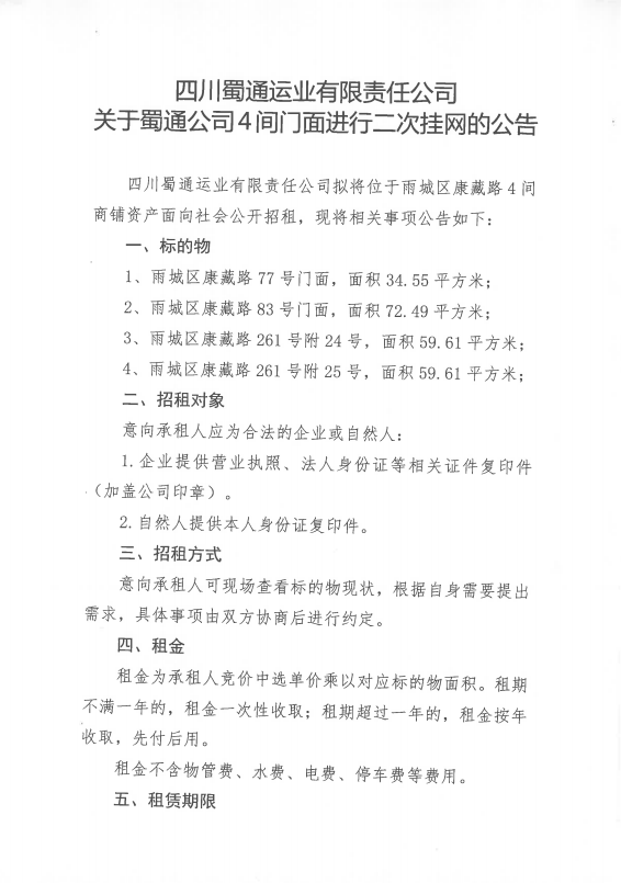 四川蜀通運(yùn)業(yè)有限責(zé)任公司關(guān)于蜀通公司4間門(mén)面進(jìn)行二次掛網(wǎng)的公告附件