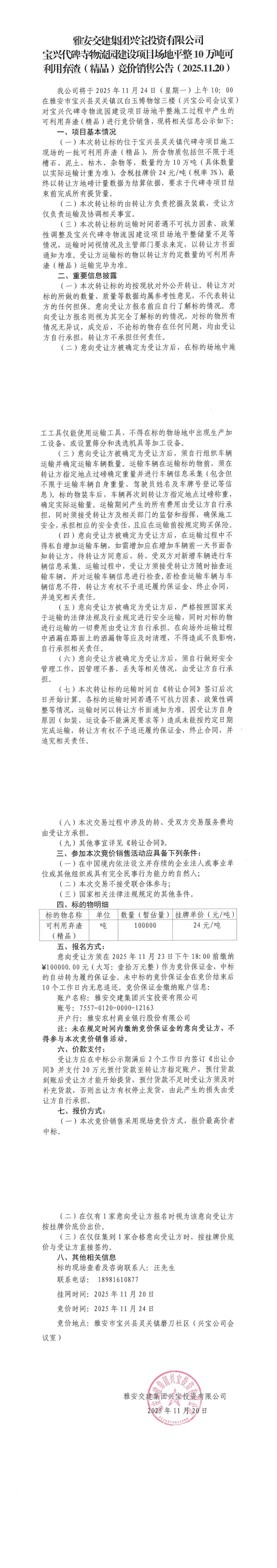雅安交建集團(tuán)興寶投資有限公司寶興代碑寺物流園建設(shè)項(xiàng)目場(chǎng)地平整10萬(wàn)噸可利用棄渣(精品)競(jìng)價(jià)銷售公告(2025.11.20)